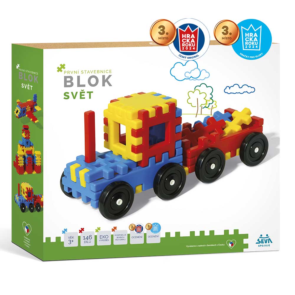 První stavebnice BLOK – Svět potěší ty nejmenší stavitele, a to již od věku 3 let. Děti díky ní mohou poznat celý svět, např. se proletět nad krajinou letadlem, nebo si zajezdit po poli ve vlastním traktoru, postavit si dům, chatu či dokonce originální hrad. Ze 146 barevných dílků a koleček si děti mohou jednoduše vykouzlit svůj vlastní svět!